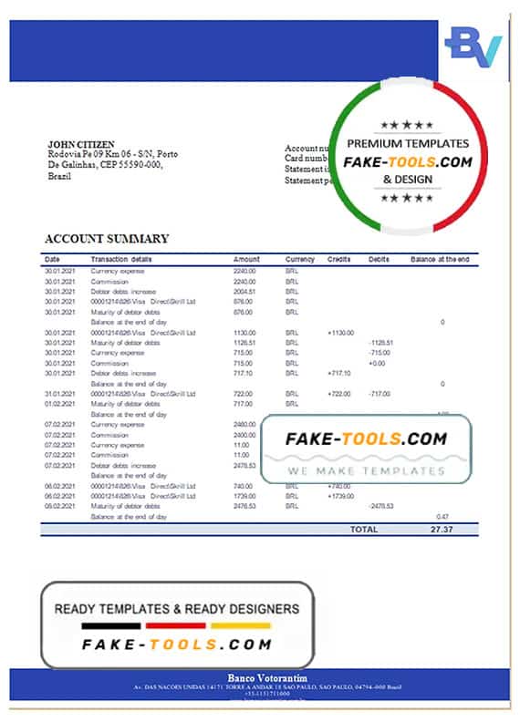 Brazil Banco Votorantim bank statement template in Word and PDF format