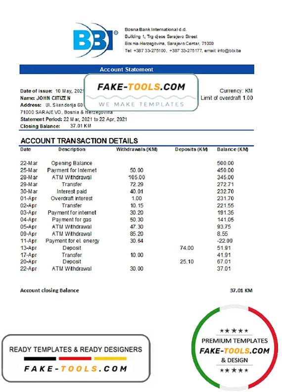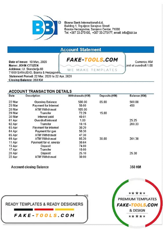 Bosnia and Herzegovina Bosna Bank International proof of address bank statement template in Word and PDF format