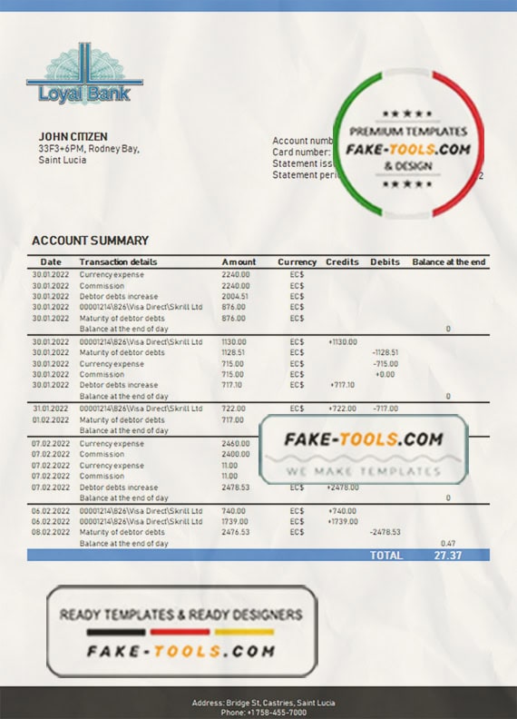 Saint Lucia Loyal Bank bank proof of address statement template in Word and PDF format