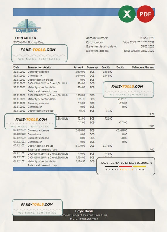 Saint Lucia Loyal bank statement, Excel and PDF template