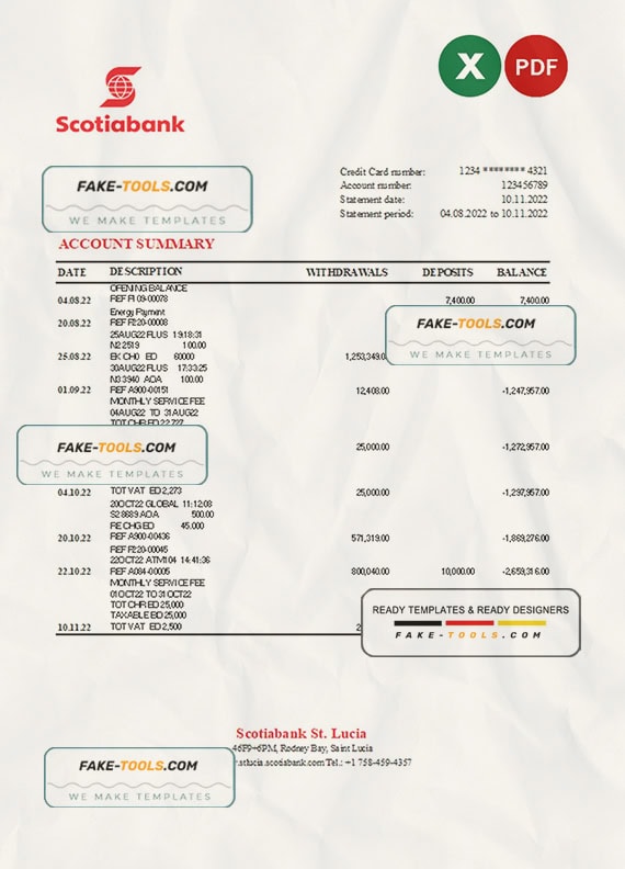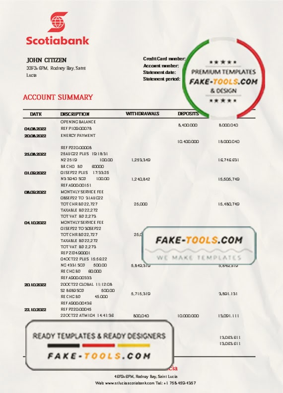 Saint Lucia Scotiabank bank proof of address statement template in Word and PDF format