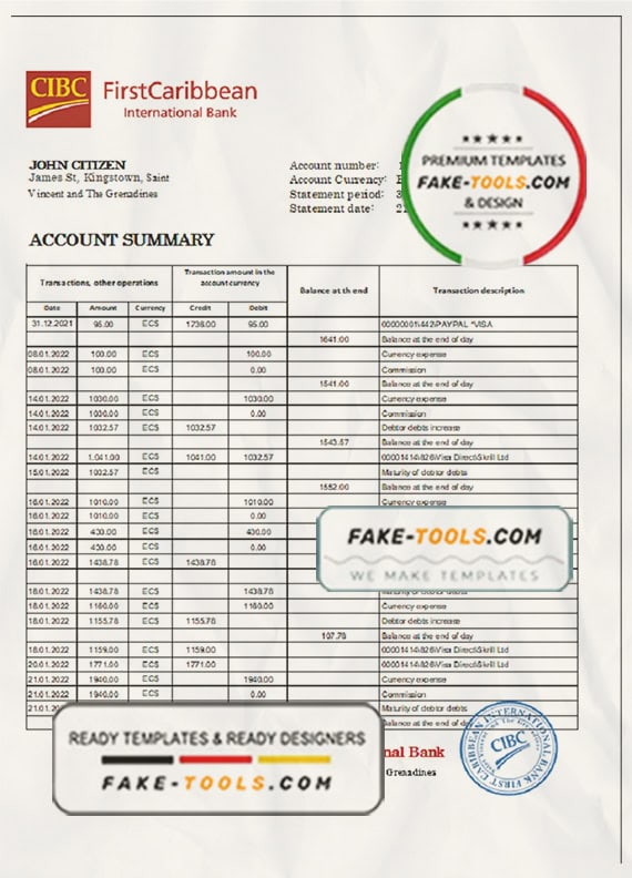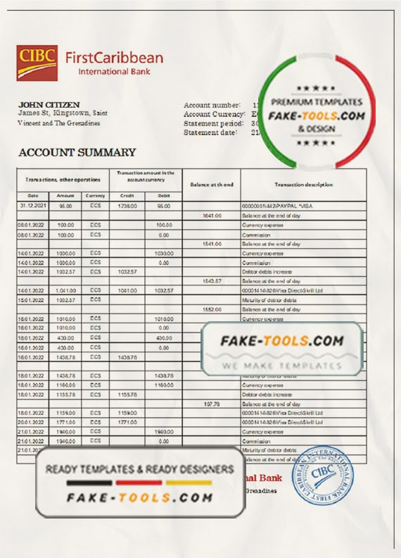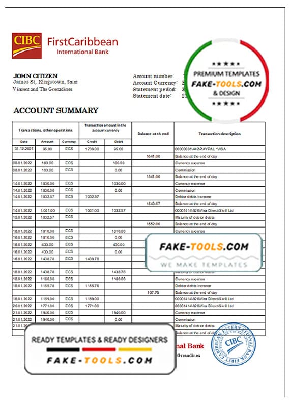 Saint Vincent and The Grenadines First Caribbean International Bank bank proof of address statement template in Word and PDF format
