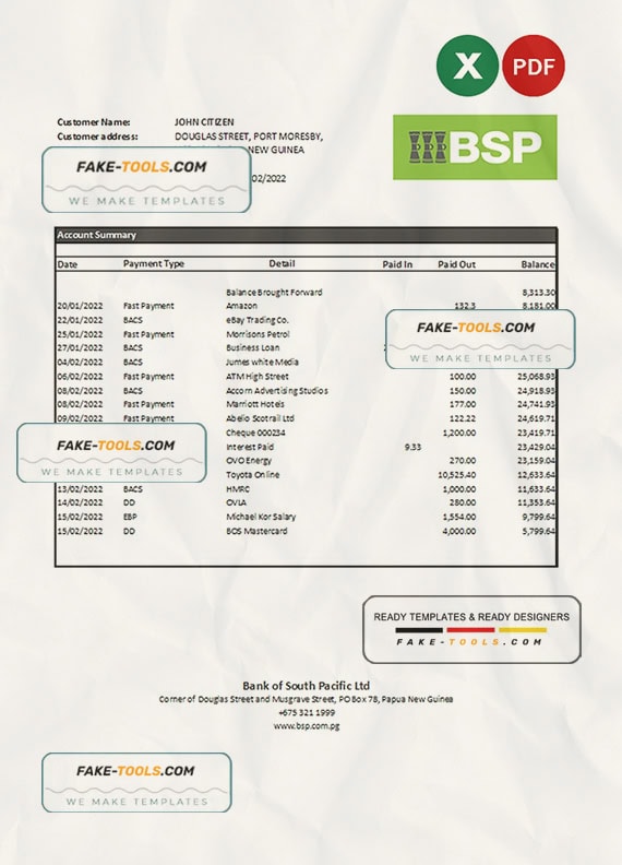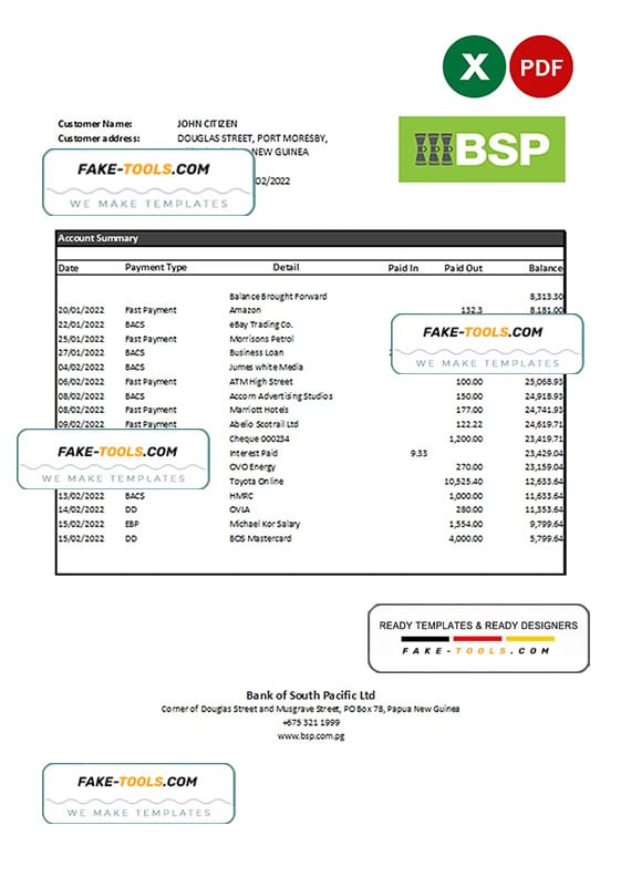 Papua New Guinea BSP bank statement Excel and PDF template