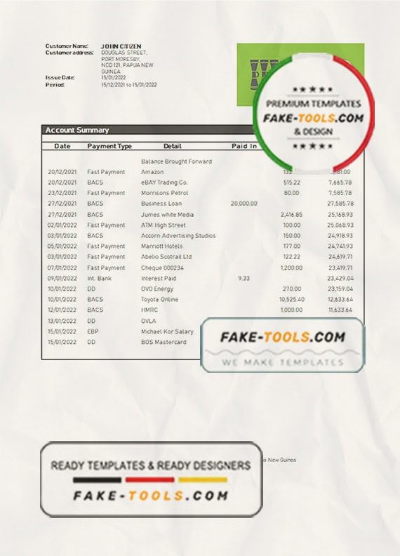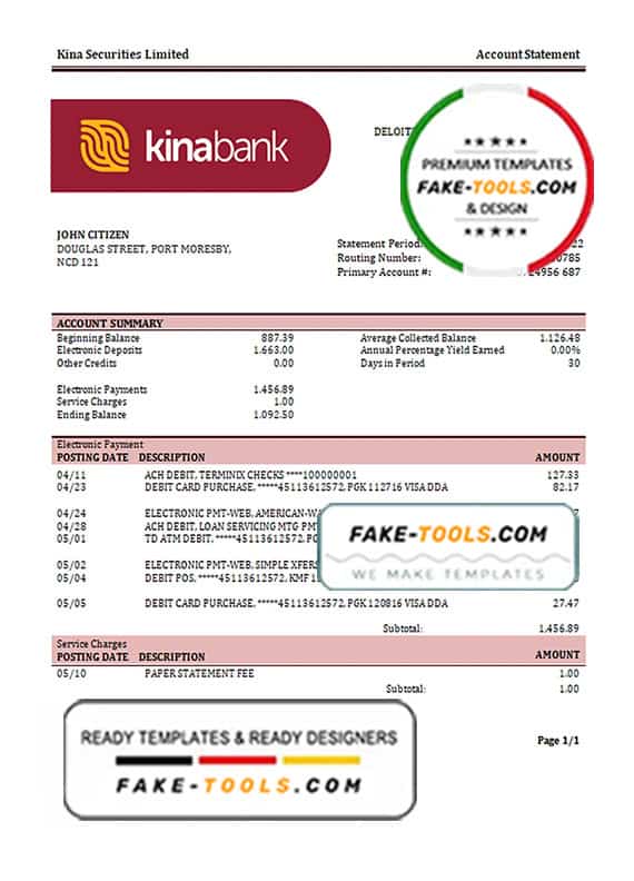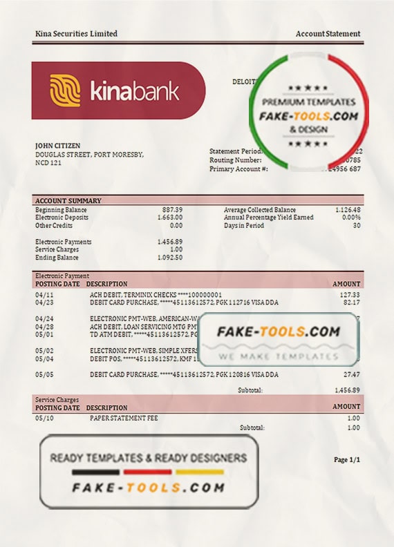 Papua New Guinea Kina Securities Limites bank statement template in Word and PDF format