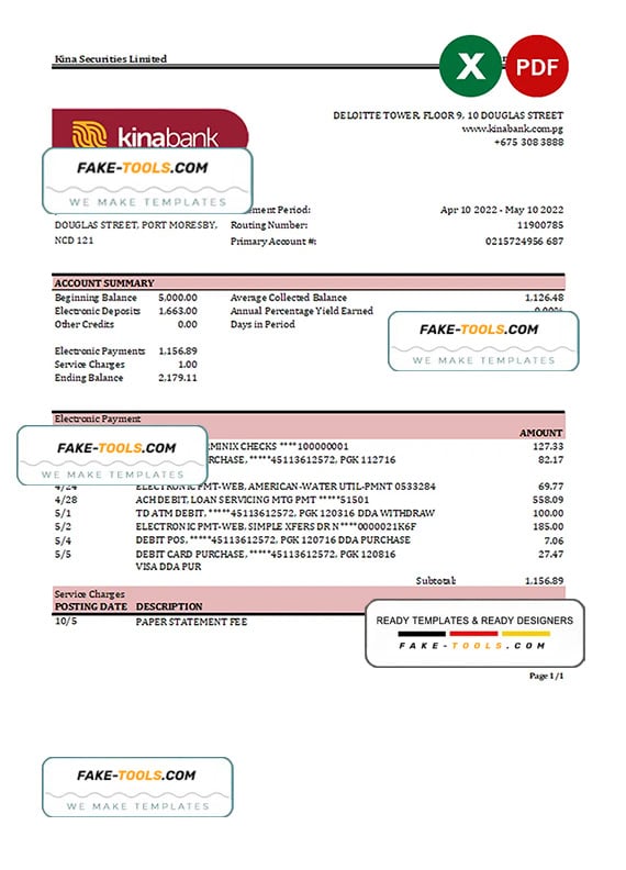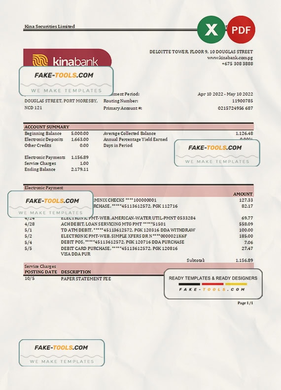 Papua New Guinea Kina Securities Limites bank statement Excel and PDF template