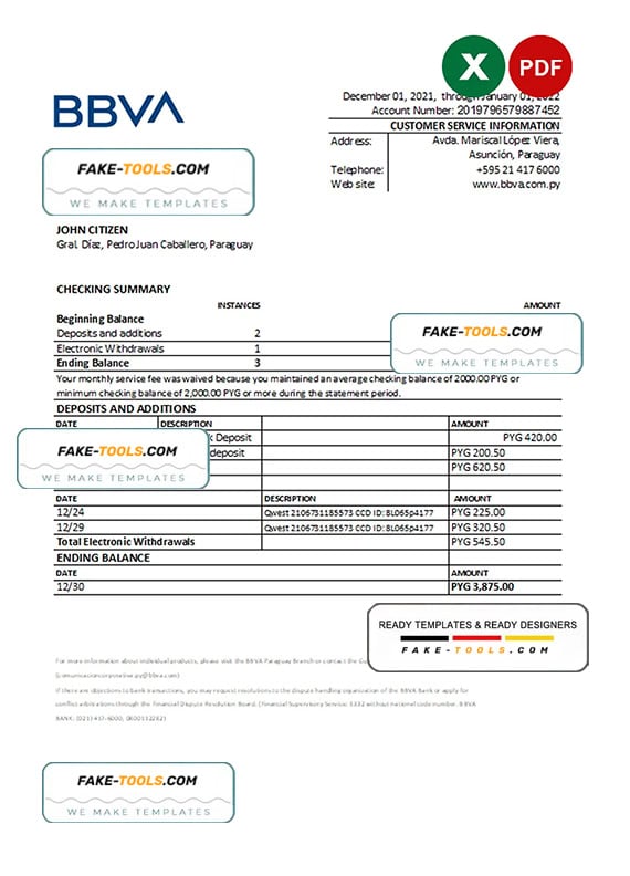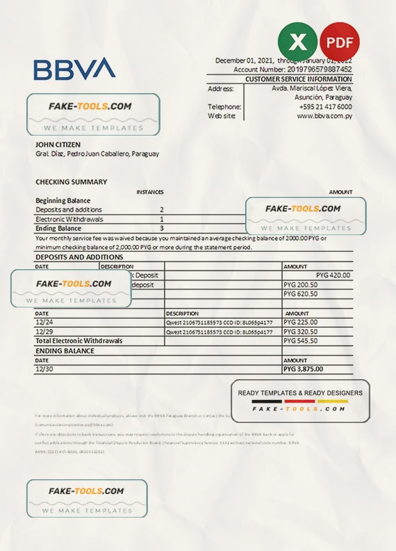 Paraguay BBVA bank statement Excel and PDF template
