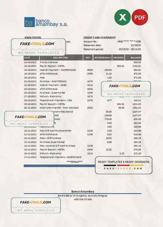 Paraguay Banco Amambay bank statement Excel and PDF template