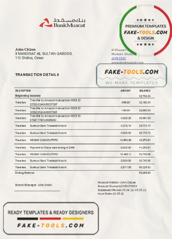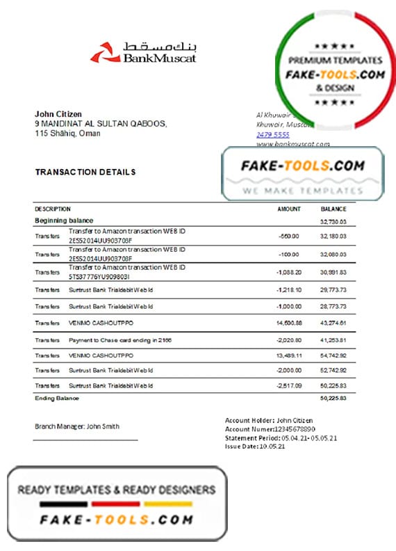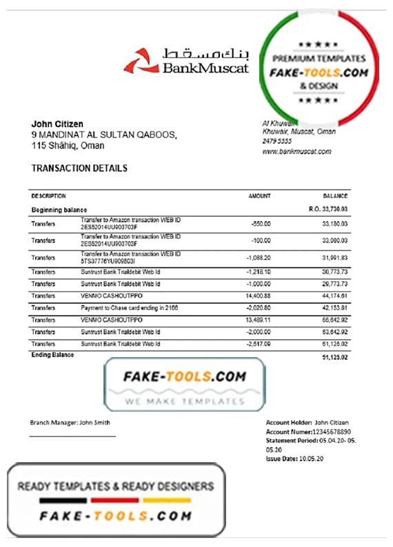 Oman Bank Muscat proof of address bank statement template in Word and PDF format (.doc and .pdf)