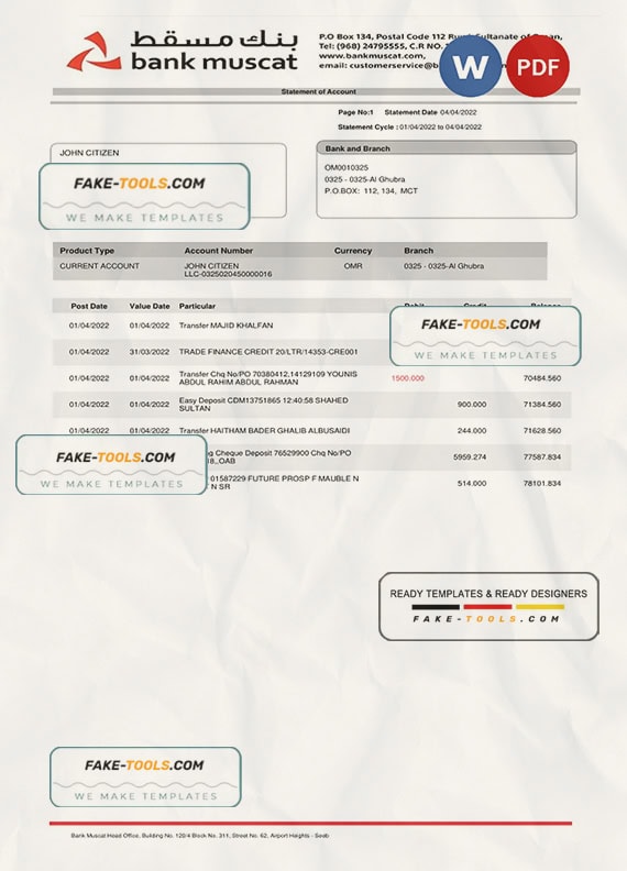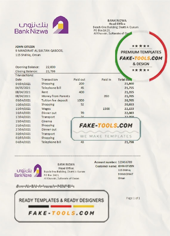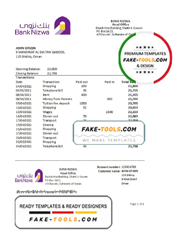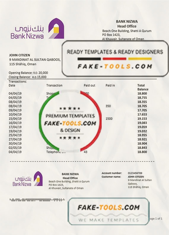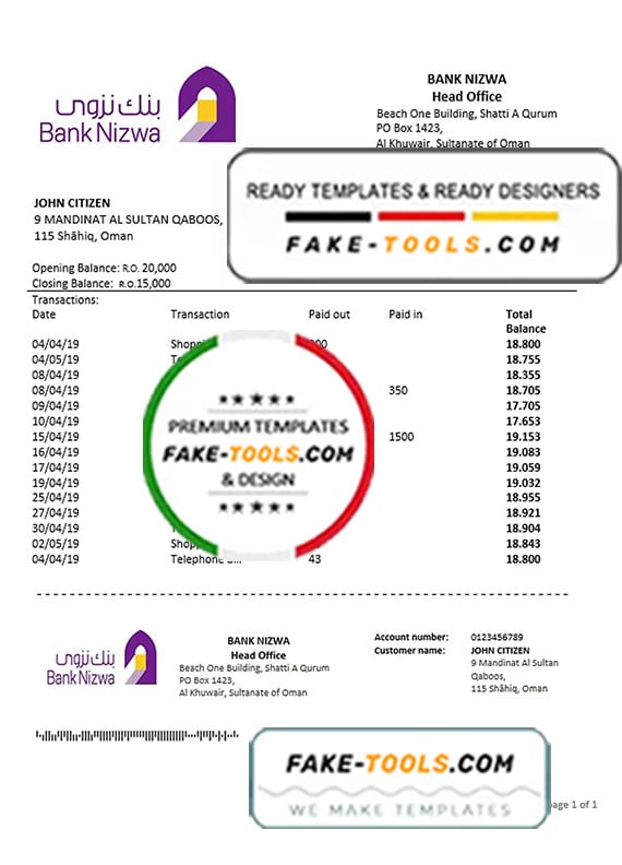 Oman Bank Nizwa proof of address bank statement template in Word and PDF format