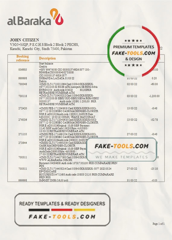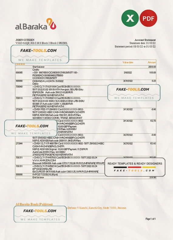 Pakistan Al Baraka bank statement template in Word and PDF format