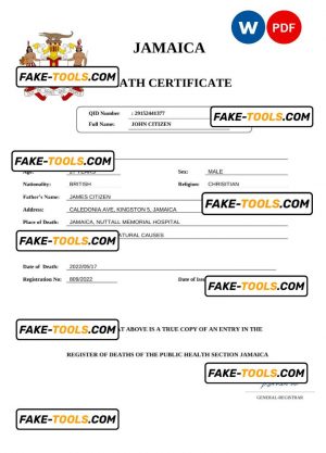 Jamaica vital record death certificate Word and PDF template