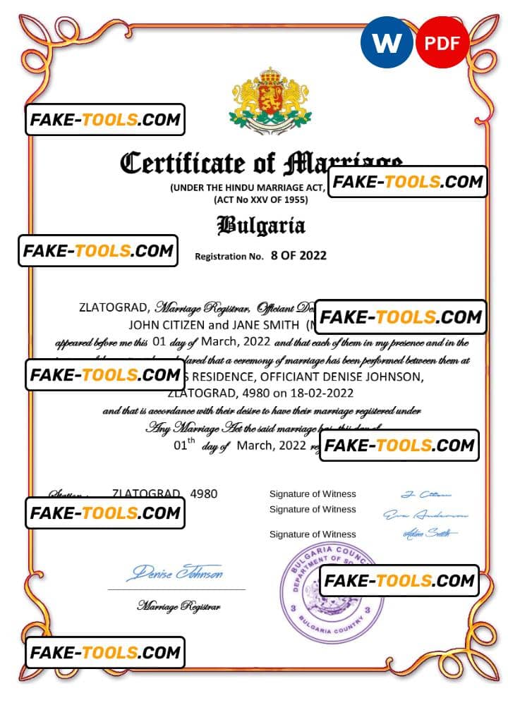 Bulgaria marriage certificate Word and PDF template, fully editable