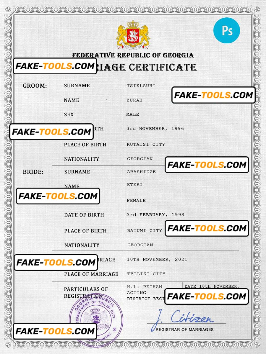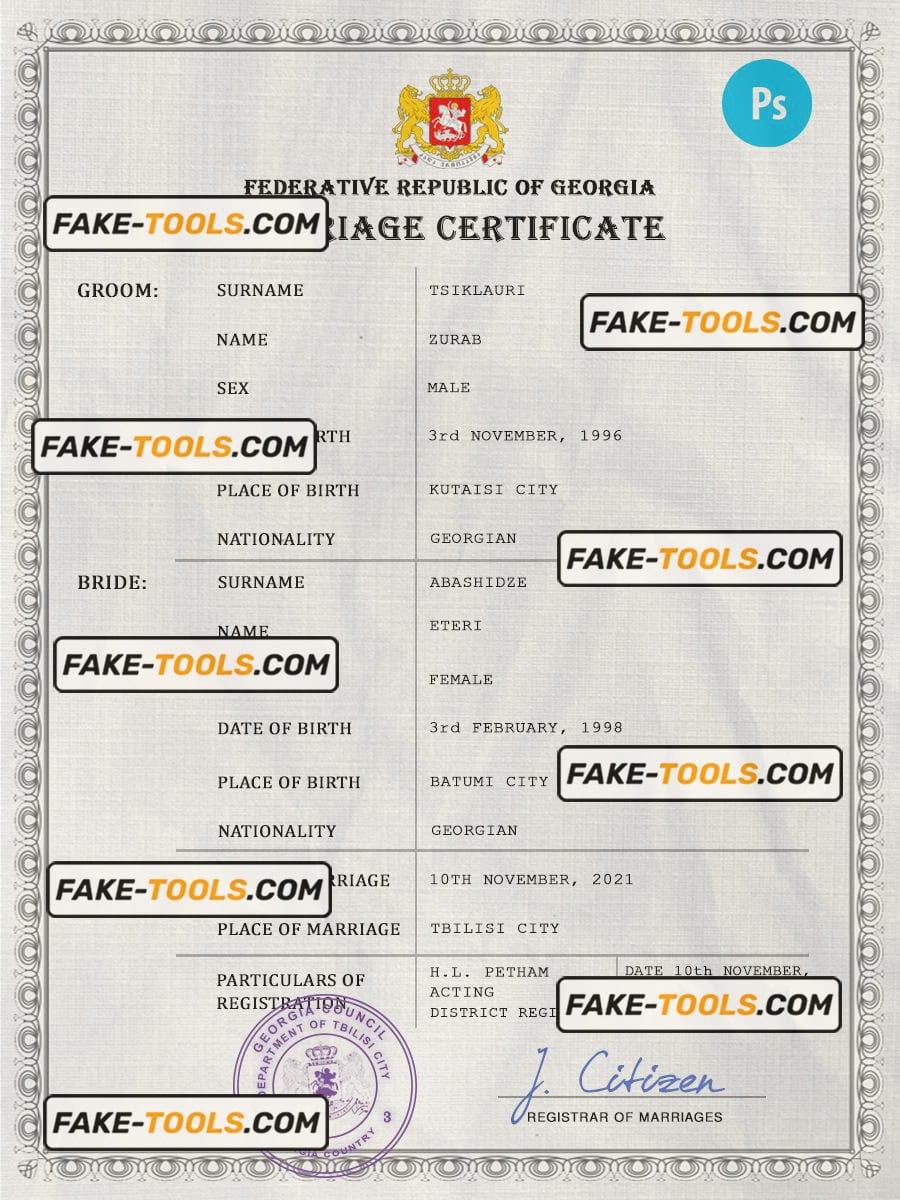 Georgia marriage certificate PSD template, fully editable