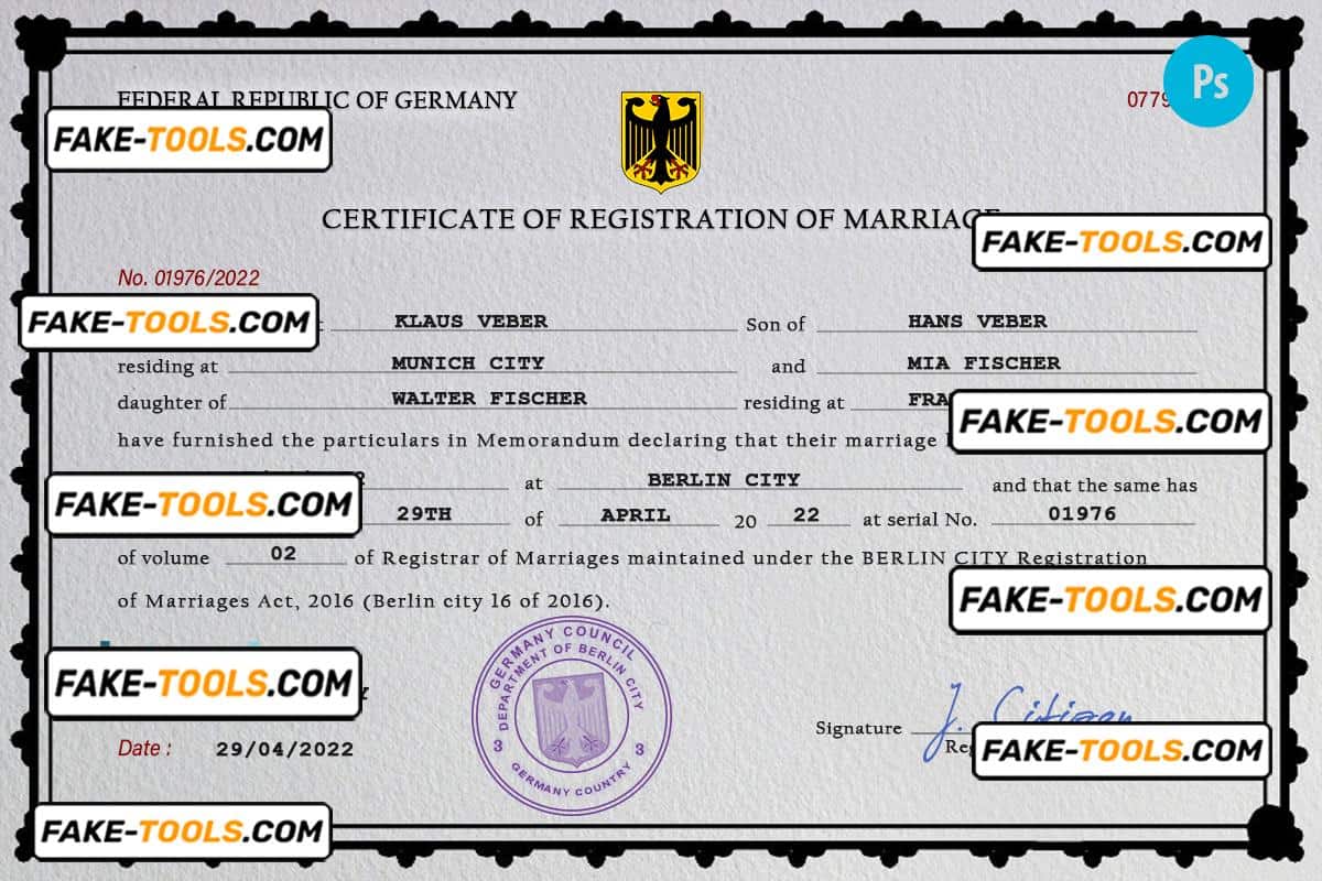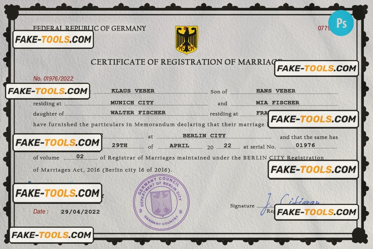 Germany marriage certificate PSD template, completely editable