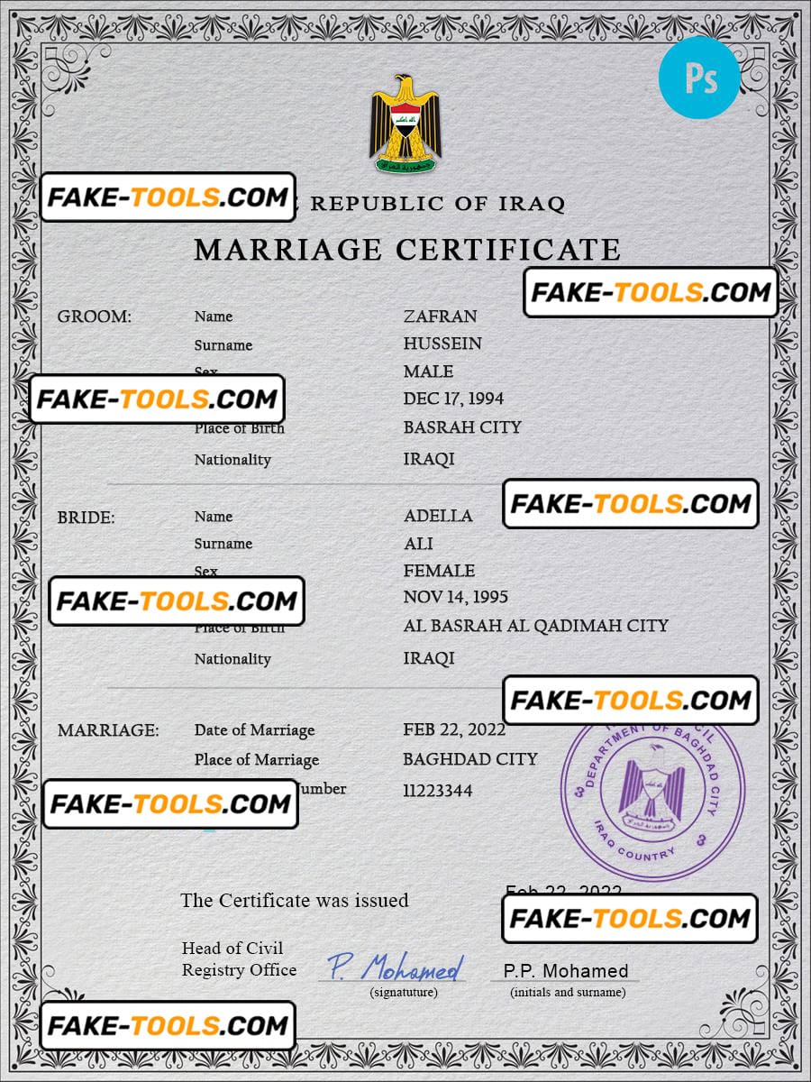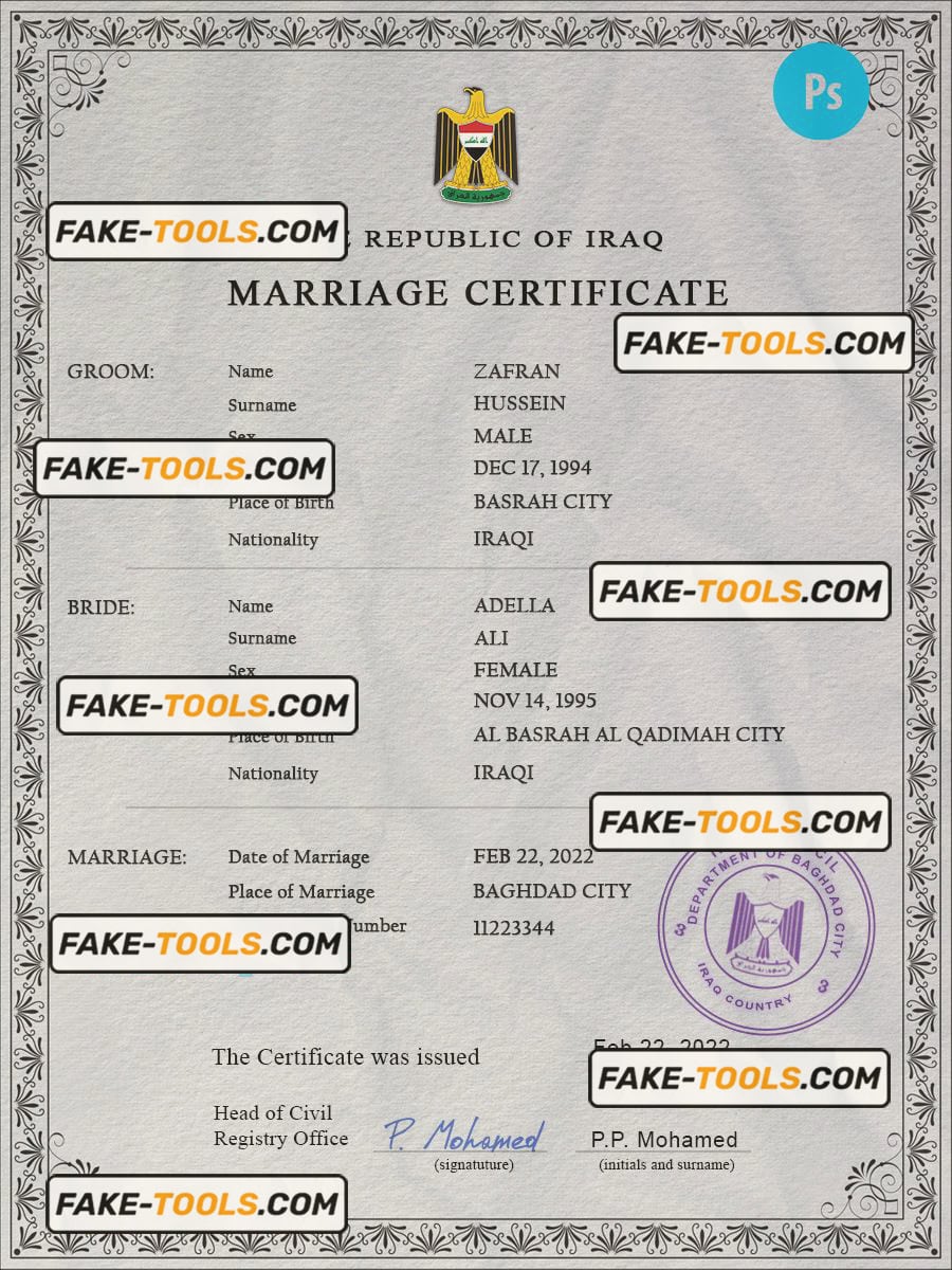 Iraq marriage certificate PSD template, completely editable