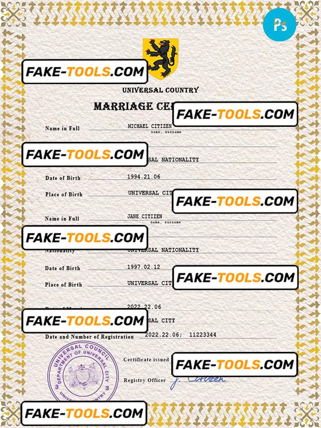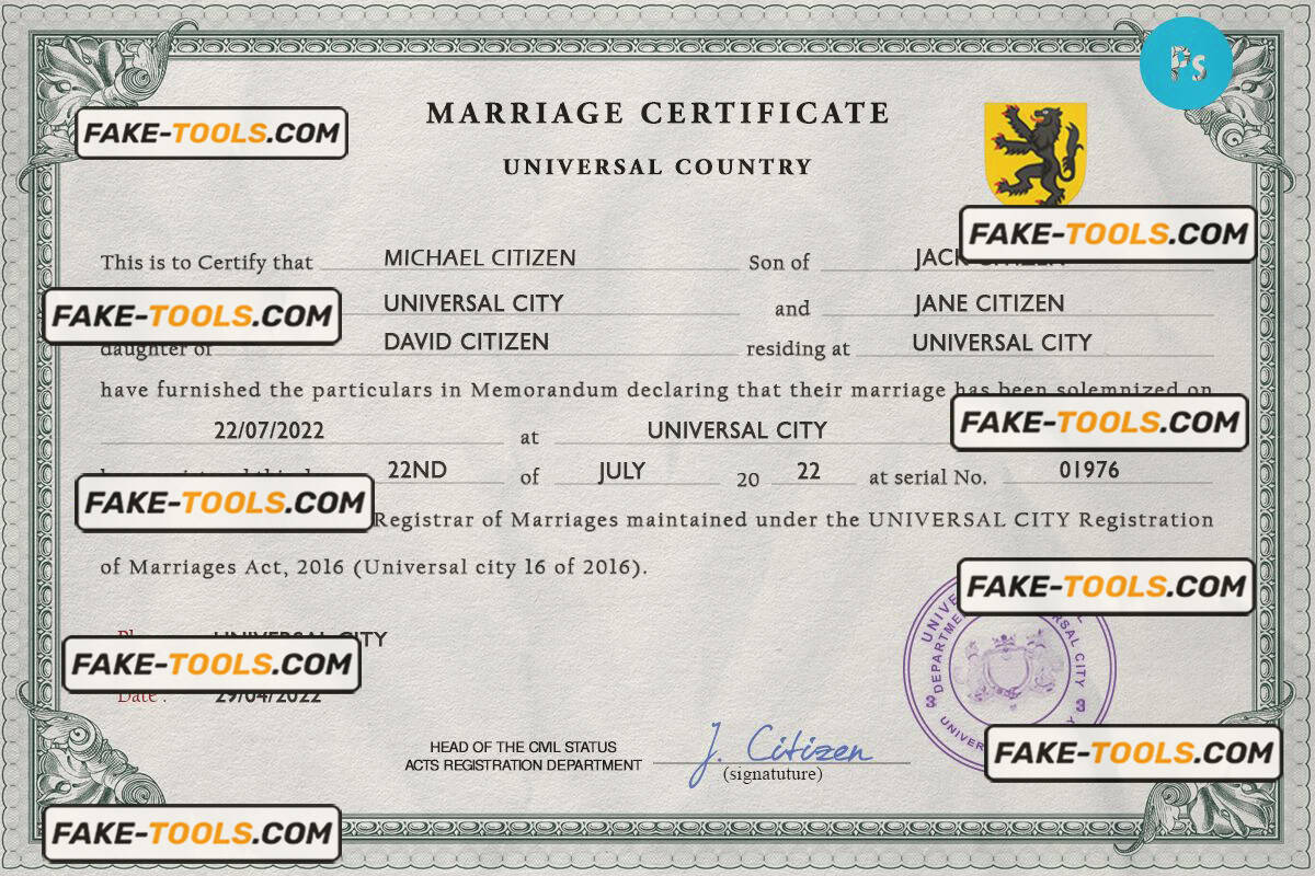 full-frontal universal marriage certificate Word and PDF template, fully editable