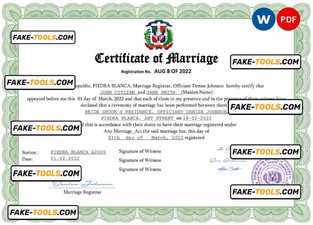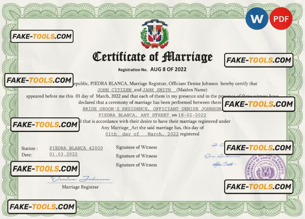 Dominican Republic marriage certificate Word and PDF template, fully editable