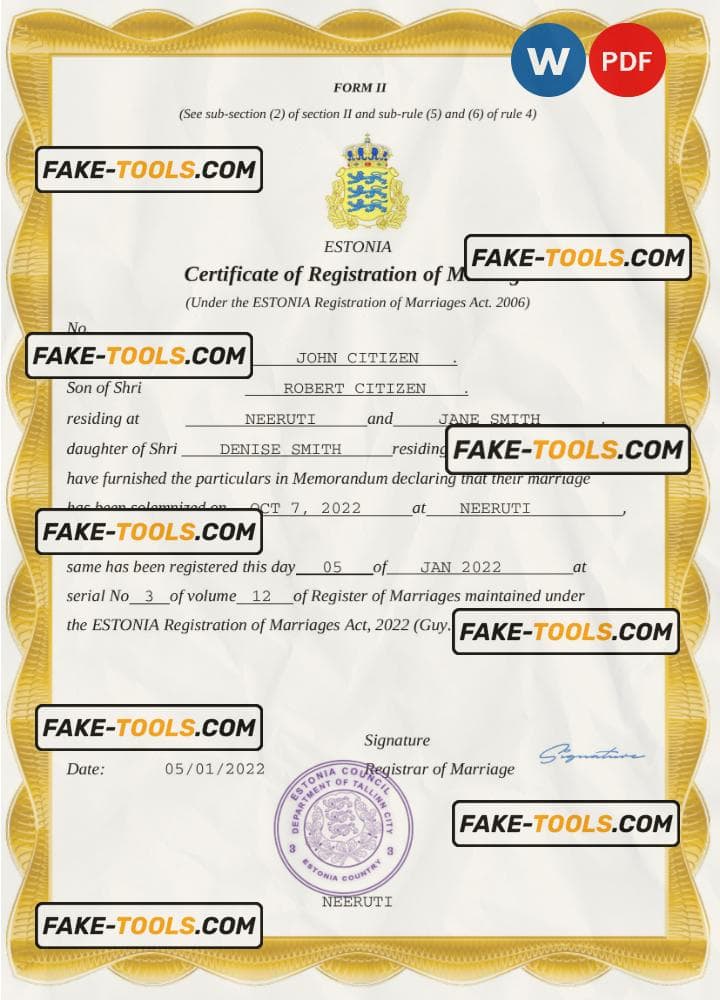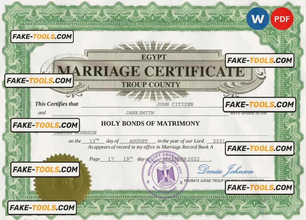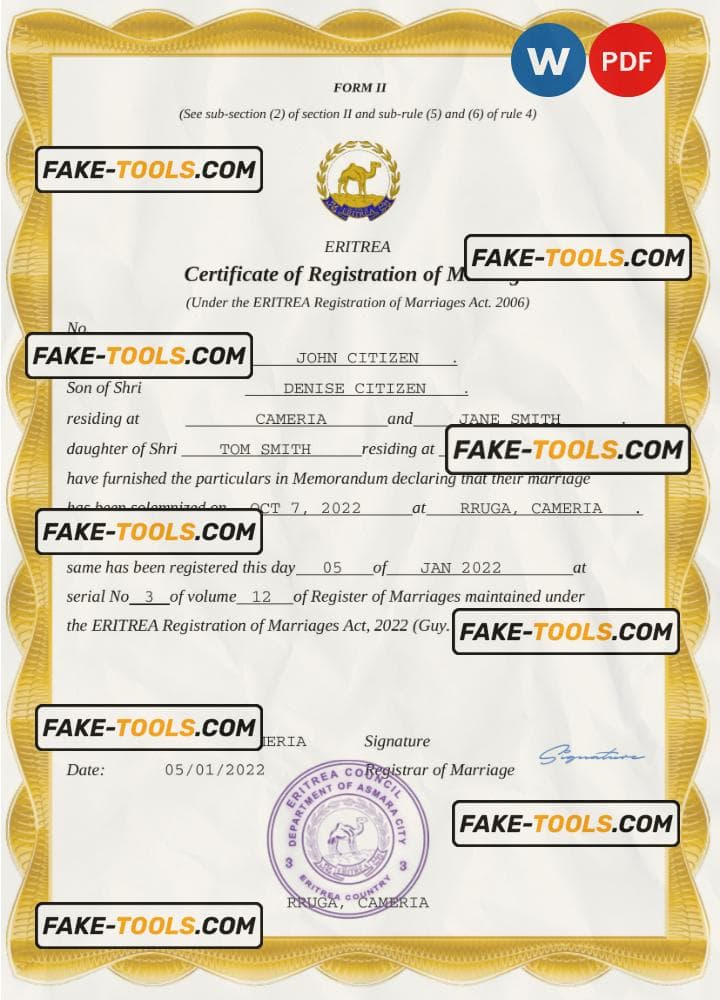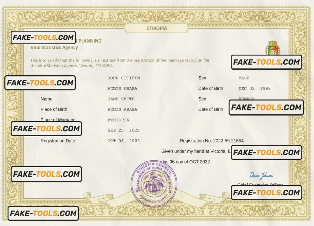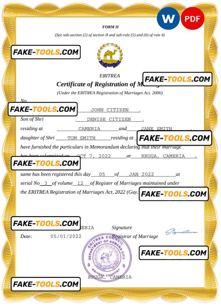 Ethiopia marriage certificate Word and PDF template, fully editable