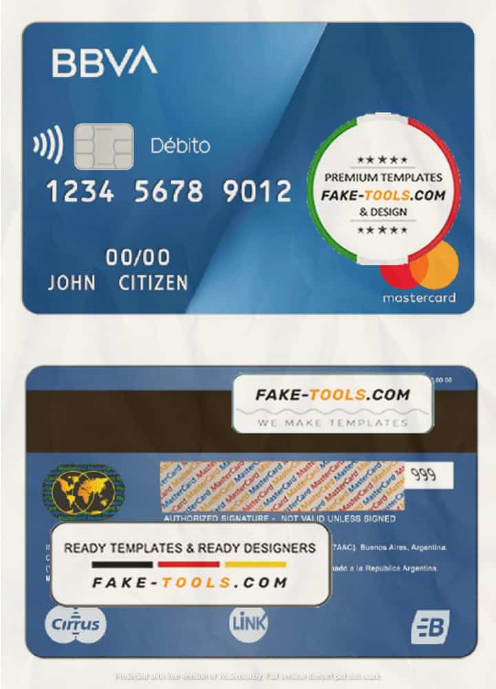 Argentina BBVA bank MasterCard debit card template in PSD format, fully editable, with all fonts
