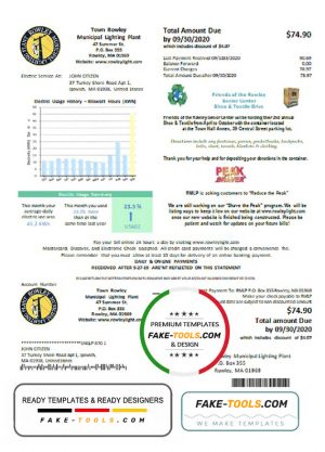 USA Massachusetts Town of Rowley Municipal Lighting Plant electricity utility bill template in Word and PDF format