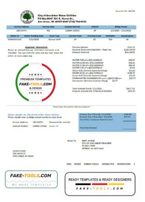 USA Michigan City of Ann Arbor Water Utilities bill template in Word and PDF format