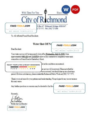 USA Michigan City of Richmond water utility bill shut off notice, Word and PDF template