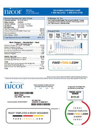 USA Illinois Nicor gas utility bill template in Word and PDF format
