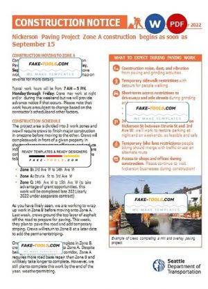 USA Washington Seattle Construction Notice, Word and PDF template, 2 pages