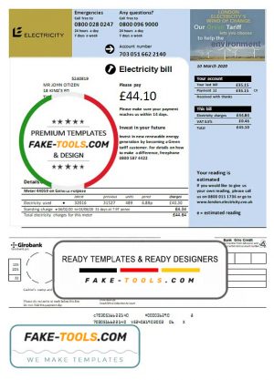United Kingdom Electricity utility bill template in Word and PDF format