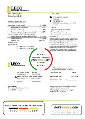 Sri Lanka LECO Company electricity utility bill template in Word and PDF format