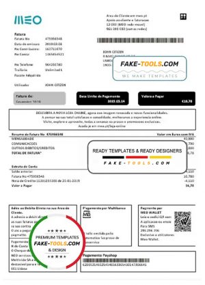Portugal MEO utility bill template in Word and PDF format, fully editable