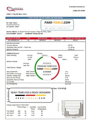 Qatar Power Company electricity utility bill template in Word and PDF format