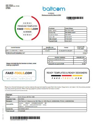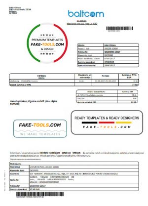 Latvia Baltcom telecommunications utility bill template in Word and PDF format (English version)