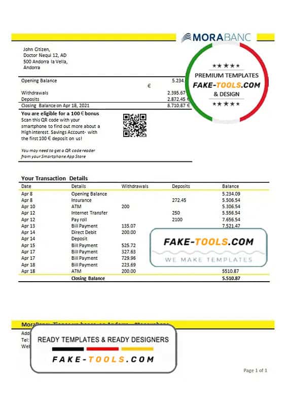 Grab now fully editable Andorra MoraBank Bank Statement Word Template from our website Fake Tools and put your own info to create Fake Bank Statement Word template and ready your own novelty documents. It’ll be so beneficial if your Bank Statement is expired, stolen or not available. We also have passport psd template, ID Card psd template, Bank Statement psd template, drivers license psd template & fake utility bill for proof of address.