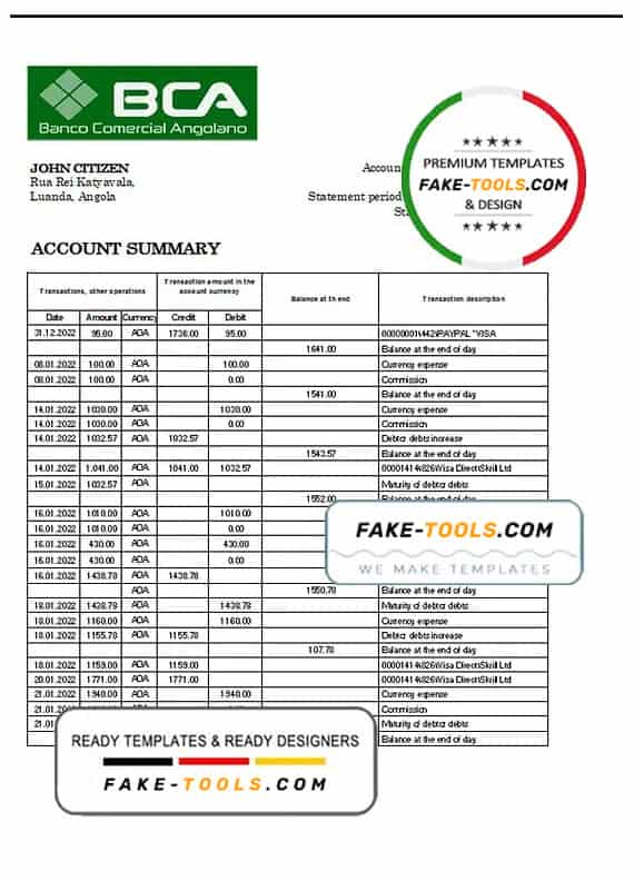 Grab now fully editable Angola Banco Comercial Angolano Bank Statement Excel Template from our website Fake Tools and put your own info to create Fake Bank Statement template Excel and ready your own novelty documents. It’ll be so beneficial if your Bank Statement is expired, stolen or not available. We also have passport psd template, ID Card psd template, Bank Statement psd template, drivers license psd template & fake utility bill for proof of address.