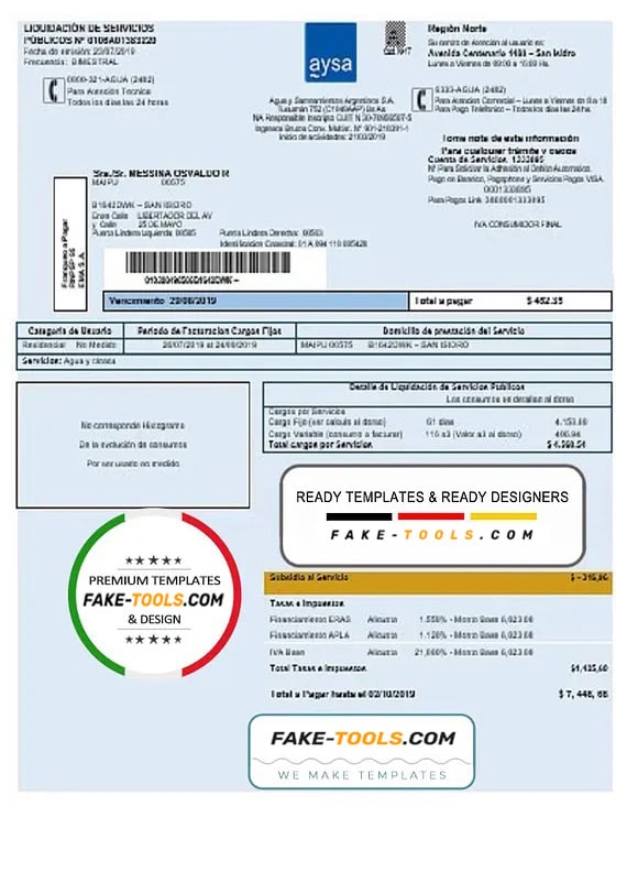 Grab now fully editable Argentina water utility bill Word Template from our website fake tools and put your own info to create a fake copy of Fake Argentina water utility bill Word template and ready your own novelty documents. It’ll be so beneficial if your utility bill is expired, stolen or not available. We also have printable passport psd template, ID Card psd template, Bank Statement psd template, fake driver license front and back & Utility bill psd template.
