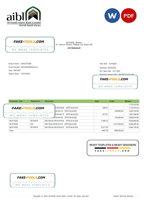 Grab now fully editable Bangladesh Al-Arafah Islami Bank Statement Word Template from our website Fake Tools and put your own info to create Fake Bank Statement Word template and ready your own novelty documents. It’ll be so beneficial if your Bank Statement is expired, stolen or not available. We also have passport psd template, ID Card psd template, Bank Statement psd template, drivers license psd template & fake utility bill for proof of address.