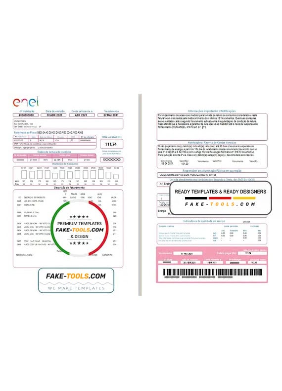 Grab now fully editable Brazil ENEL electricity utility bill Word Template from our website fake tools and put your own info to create a fake copy of Fake Brazil ENEL electricity utility bill Word template and ready your own novelty documents. It’ll be so beneficial if your utility bill is expired, stolen or not available. We also have printable passport psd template, ID Card psd template, Bank Statement psd template, fake driver license front and back & Utility bill psd template.