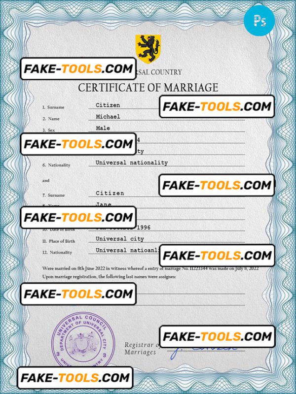 Fake cherish universal marriage certificate PSD template, completely editable.Fully editable photoshop template. purchase marriage certificate template. Easy to customize, Layer based, fonts included. you can edit this template and put any name, address, license number, Id number, birth date, height, weight, expire date, change photos etc. This Photoshop template is a layer based psd file and it’s easy to Editing. Never used low quality template. Your account may be suspended.