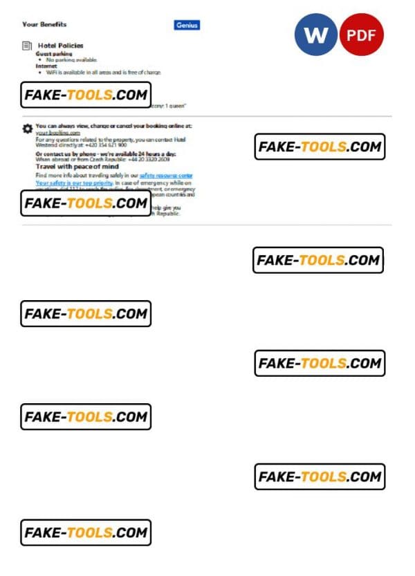 Czech Republic Fake hotel reservation Word template.Fully editable Word template. High quality blank hotel and bnb booking template. Easy to customize, fonts included. you can edit this template and put any name, address, license number, Id number, birth date, height, weight, expire date, change photos etc. This Word template is a easy to Editing.To modify this Word template file you will need a Word editing software such as Microsoft Word. Never used low quality template. Your account may be suspended.