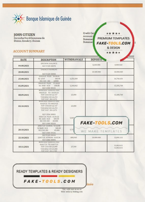 Grab now fully editable Guinea Banque Islamique de Guinée proof of address Bank Statement Word Template from our website Fake Tools and put your own info to create Fake Bank Statement Word template and ready your own novelty documents. It’ll be so beneficial if your Bank Statement is expired, stolen or not available. We also have passport psd template, ID Card psd template, Bank Statement psd template, drivers license psd template & fake utility bill for proof of address.