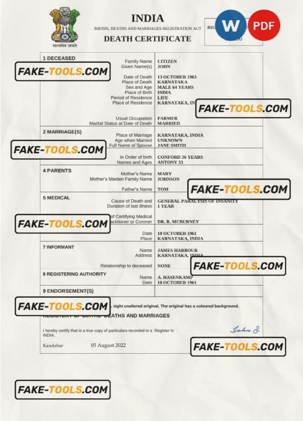 Grab now fully editable India death certificate word template from our website fake tools and put your own info to create a fake copy of Fake India death certificate word template and ready your own novelty documents. It’ll be so beneficial if your ID Card is expired, stolen or not available. We also have passport psd template, ID Card psd template, Bank Statement psd template, drivers license psd template & utility bill psd template, certificate psd template.