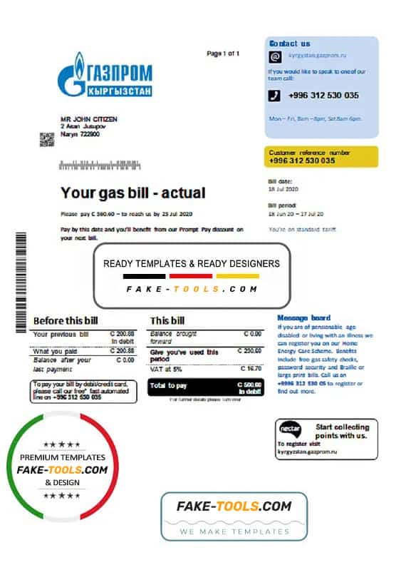 Grab now fully editable Kyrgyzstan Gazprom utility bill Word Template from our website fake tools and put your own info to create a fake copy of Fake Kyrgyzstan Gazprom utility bill Word template and ready your own novelty documents. It’ll be so beneficial if your utility bill is expired, stolen or not available. We also have printable passport psd template, ID Card psd template, Bank Statement psd template, fake driver license front and back & Utility bill psd template.