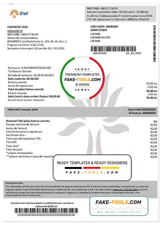 Grab now fully editable Romania Enel electricity proof of address utility bill Word Template from our website fake tools and put your own info to create a fake copy of Fake Romania Enel electricity proof of address utility bill Word template and ready your own novelty documents. It’ll be so beneficial if your utility bill is expired, stolen or not available. We also have printable passport psd template, ID Card psd template, Bank Statement psd template, fake driver license front and back & Utility bill psd template.