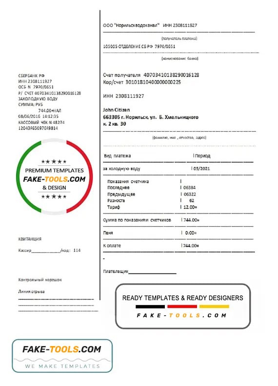 Grab now fully editable Russia water utility bill Word Template from our website fake tools and put your own info to create a fake copy of Fake Russia water utility bill Word template and ready your own novelty documents. It’ll be so beneficial if your utility bill is expired, stolen or not available. We also have printable passport psd template, ID Card psd template, Bank Statement psd template, fake driver license front and back & Utility bill psd template.