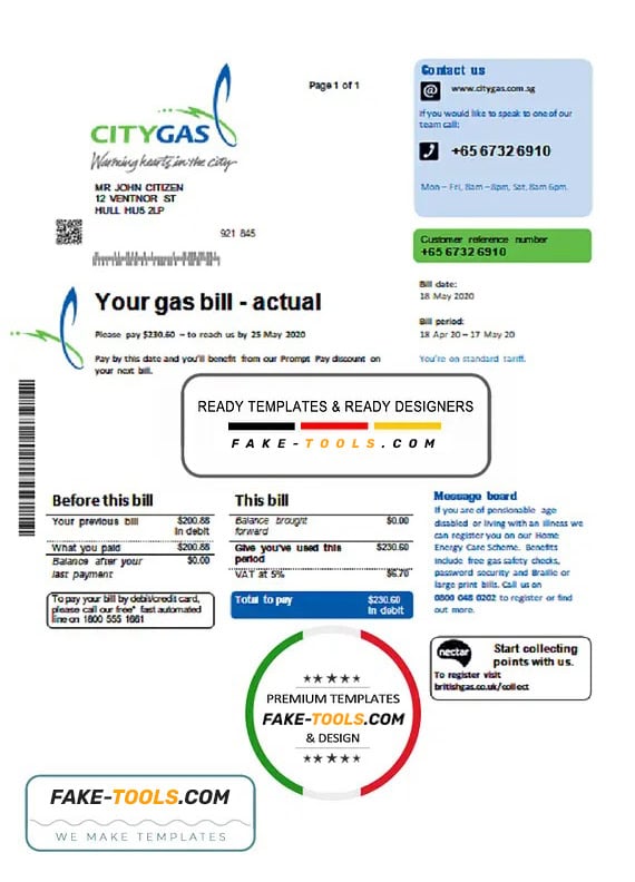 Grab now fully editable Singapore City Gas utility bill Psd Template from our website fake tools and put your own info to create a fake copy of Fake Singapore City Gas utility bill psd template and ready your own novelty documents. It’ll be so beneficial if your utility bill is expired, stolen or not available. We also have printable passport psd template, ID Card psd template, Bank Statement psd template, fake driver license front and back & Utility bill psd template.