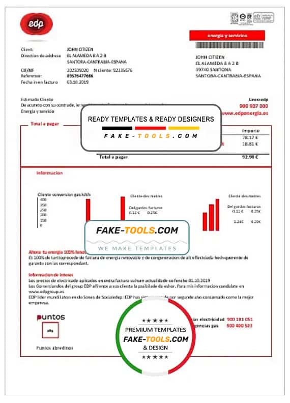 Grab now fully editable Spain EDP Energia utility bill Word Template from our website fake tools and put your own info to create a fake copy of Fake Spain EDP Energia utility bill Word template and ready your own novelty documents. It’ll be so beneficial if your utility bill is expired, stolen or not available. We also have printable passport psd template, ID Card psd template, Bank Statement psd template, fake driver license front and back & Utility bill psd template.