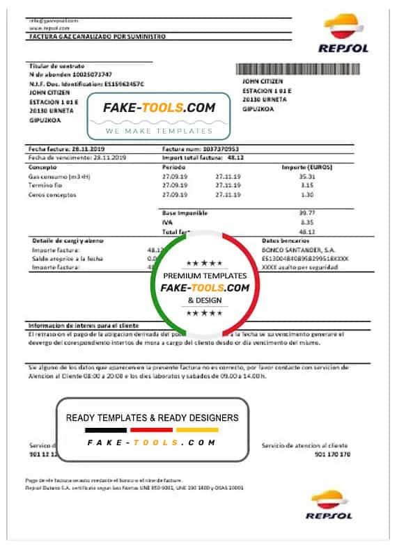 Grab now fully editable Spain Repsol gas utility bill Word Template from our website fake tools and put your own info to create a fake copy of Fake Spain Repsol gas utility bill Word template and ready your own novelty documents. It’ll be so beneficial if your utility bill is expired, stolen or not available. We also have printable passport psd template, ID Card psd template, Bank Statement psd template, fake driver license front and back & Utility bill psd template.