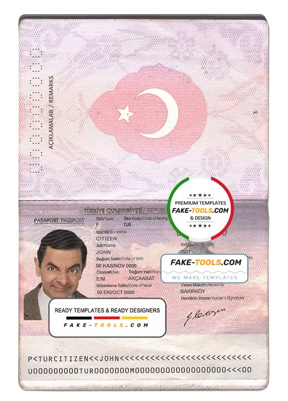 Turkey passport template psd. Fully editable photoshop template. High quality fake passport template. Easy to customize, Layer based, fonts included. you can edit this template and  put any name, address, license number, Id number, birth date, height, weight, expire date, change photos etc. This Photoshop template is a layer based psd file and it’s easy to Editing.To modify this photoshop template file you will need a Photo editing software such as Adobe Photoshop No need to be expert on editing software like adobe Photoshop. However, You just have to basic knowledge on adobe photoshop, to edit this template. Never used low quality template. Your account may be suspended.