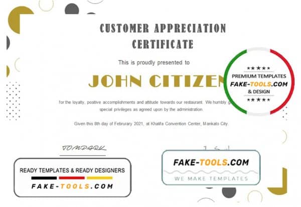 Grab now fully editable USA Customer Appreciation certificate word template from our website fake tools and put your own info to create a fake copy of Fake USA Customer Appreciation certificate word template and ready your own novelty documents. It’ll be so beneficial if your ID Card is expired, stolen or not available. We also have passport psd template, ID Card psd template, Bank Statement psd template, drivers license psd template & utility bill psd template, certificate psd template